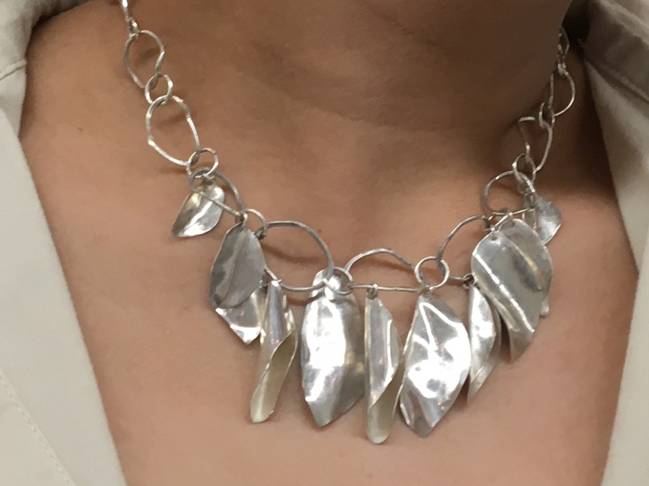 葉に降り注ぐ雨粒が弾ける瞬間をイメージしてデザインしたネックレスです。葉の一枚一枚、雨粒にはその瑞々しさと生命感を込め、すべて手作業で丁寧に仕上げました。