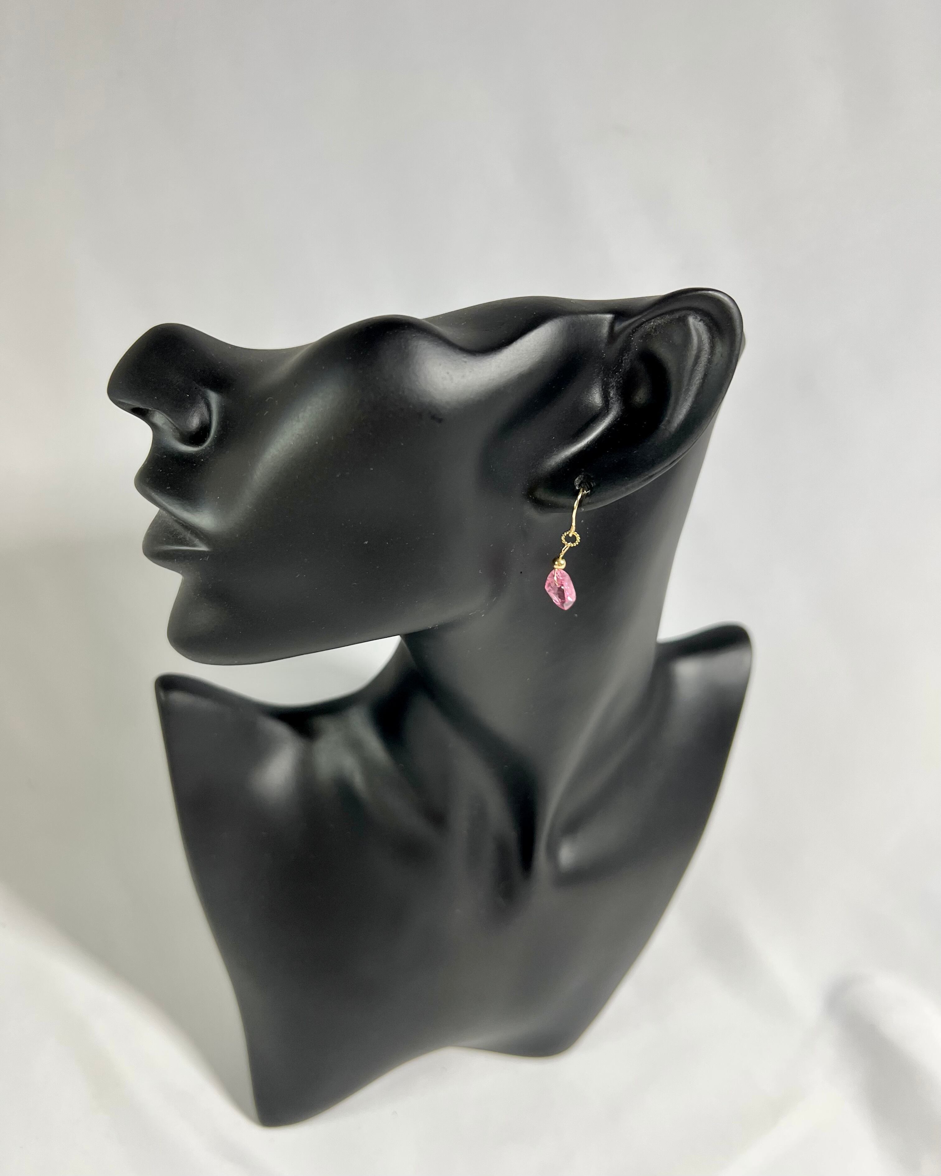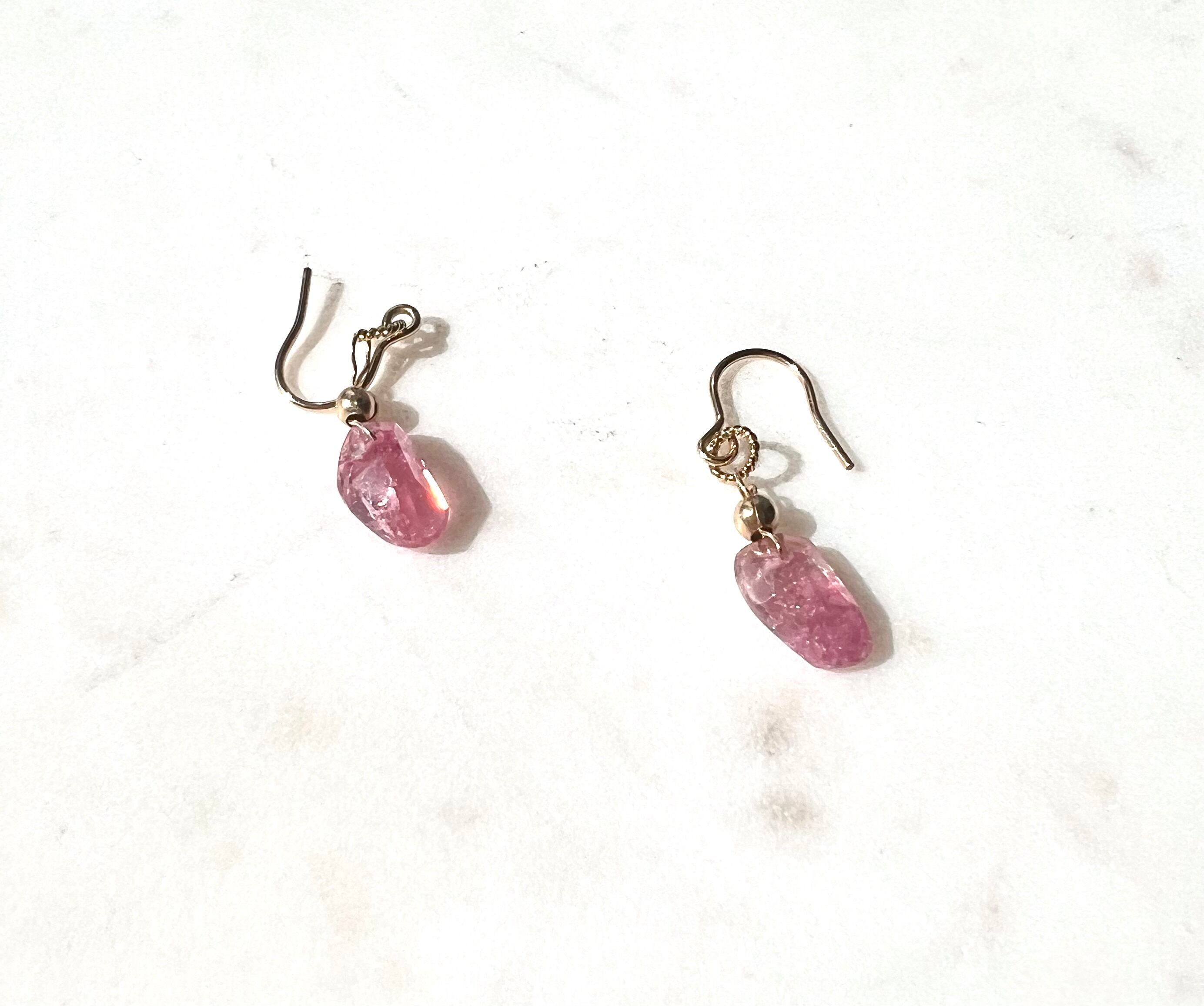 Pierced earrings featuring the vibrant hues of natural pink tourmaline, beautifully accented with 14KGF beads to enhance the stone’s natural allure.