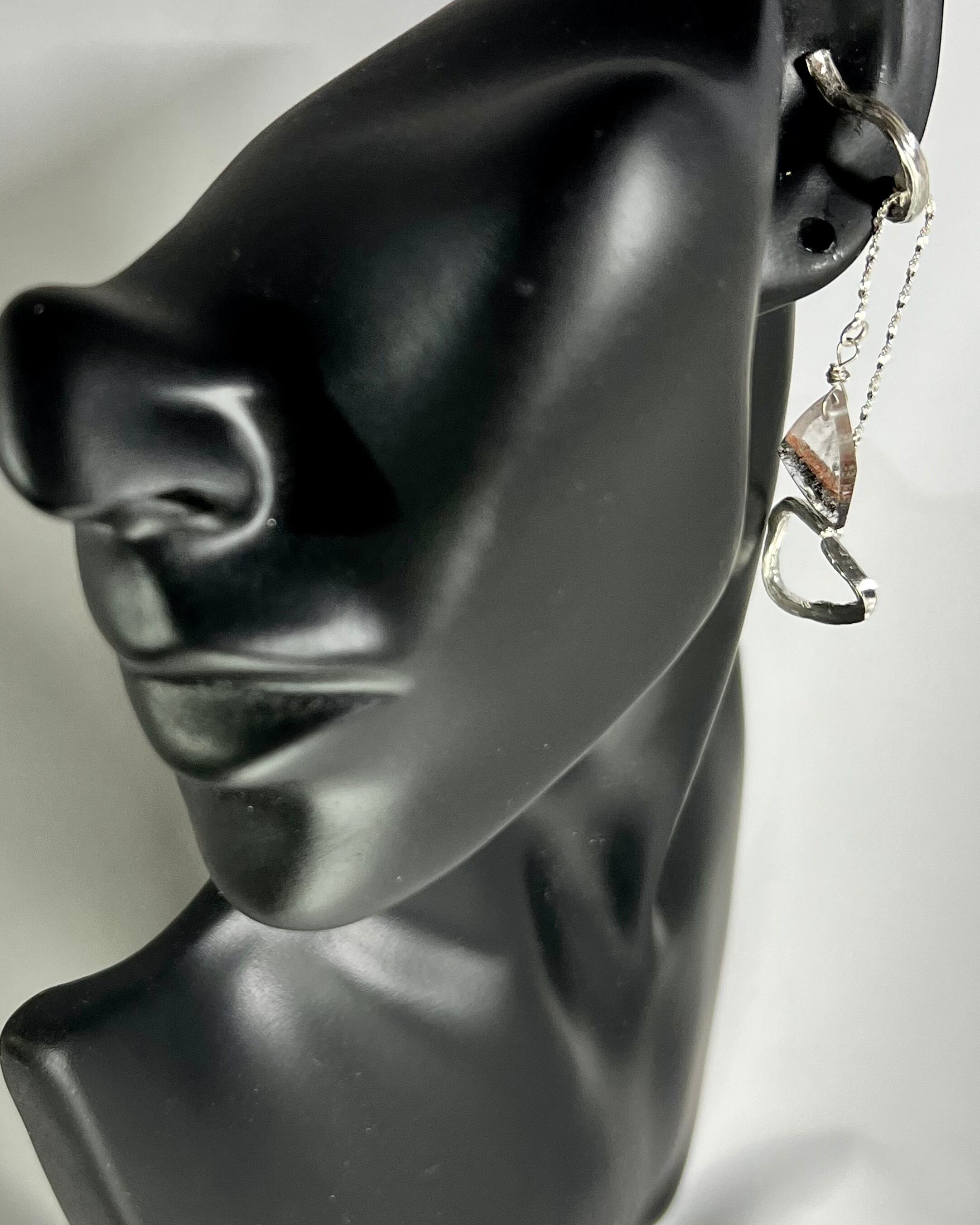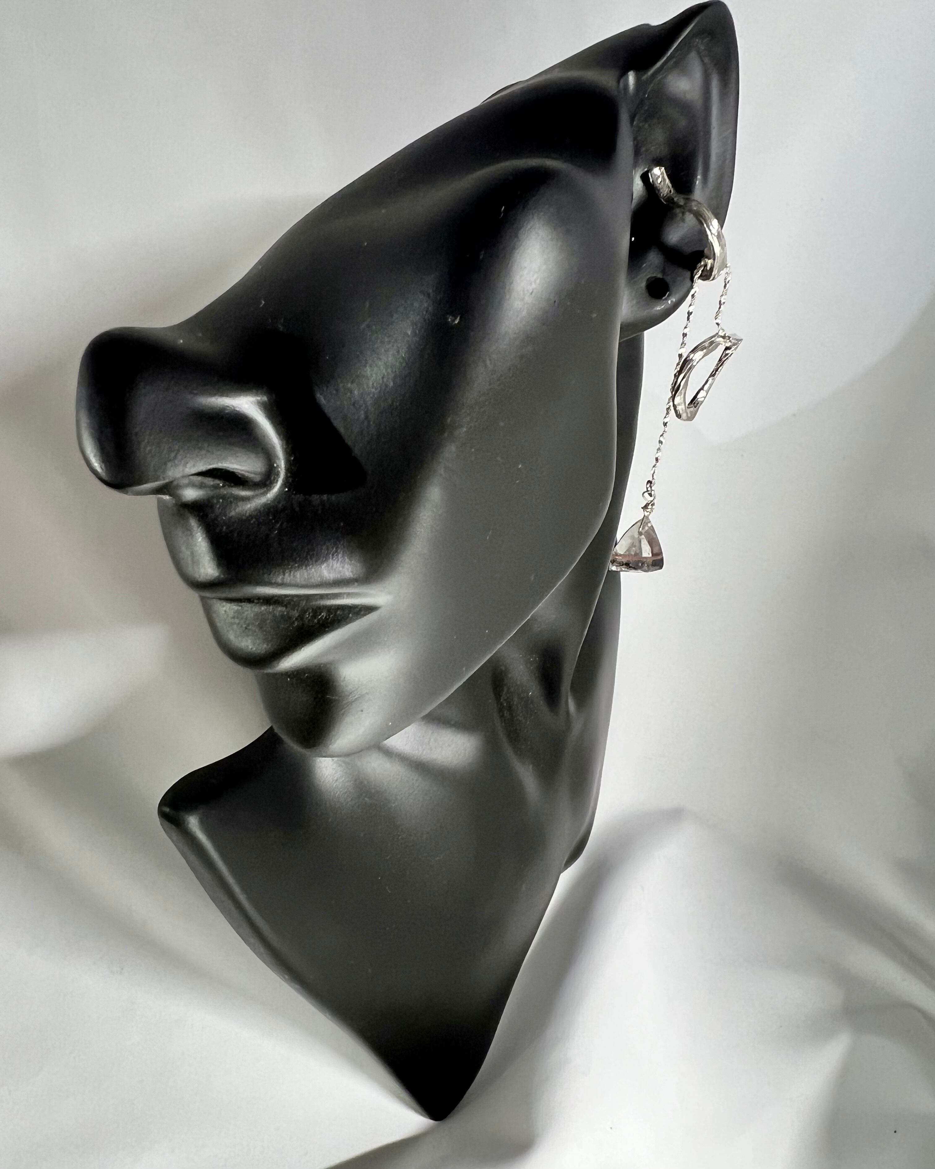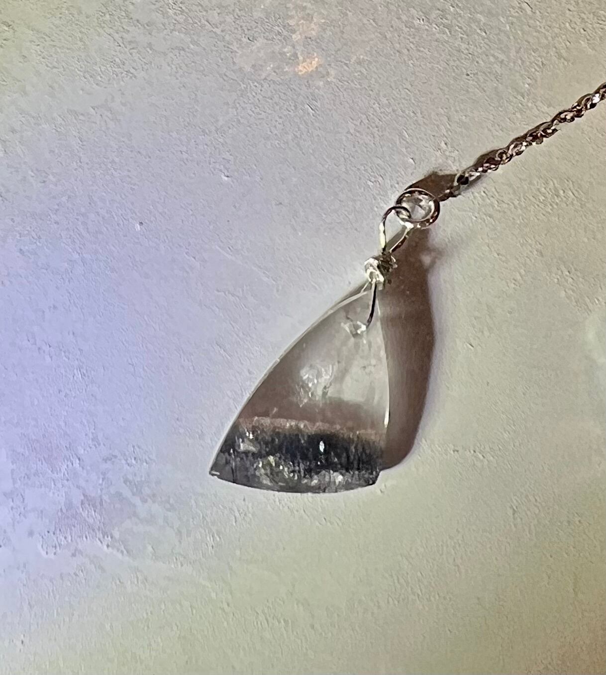 Super Seven Quartz, known for its sharp cut and deep, shimmering lines, is paired with triangular silver elements that complement the stone’s facets.
