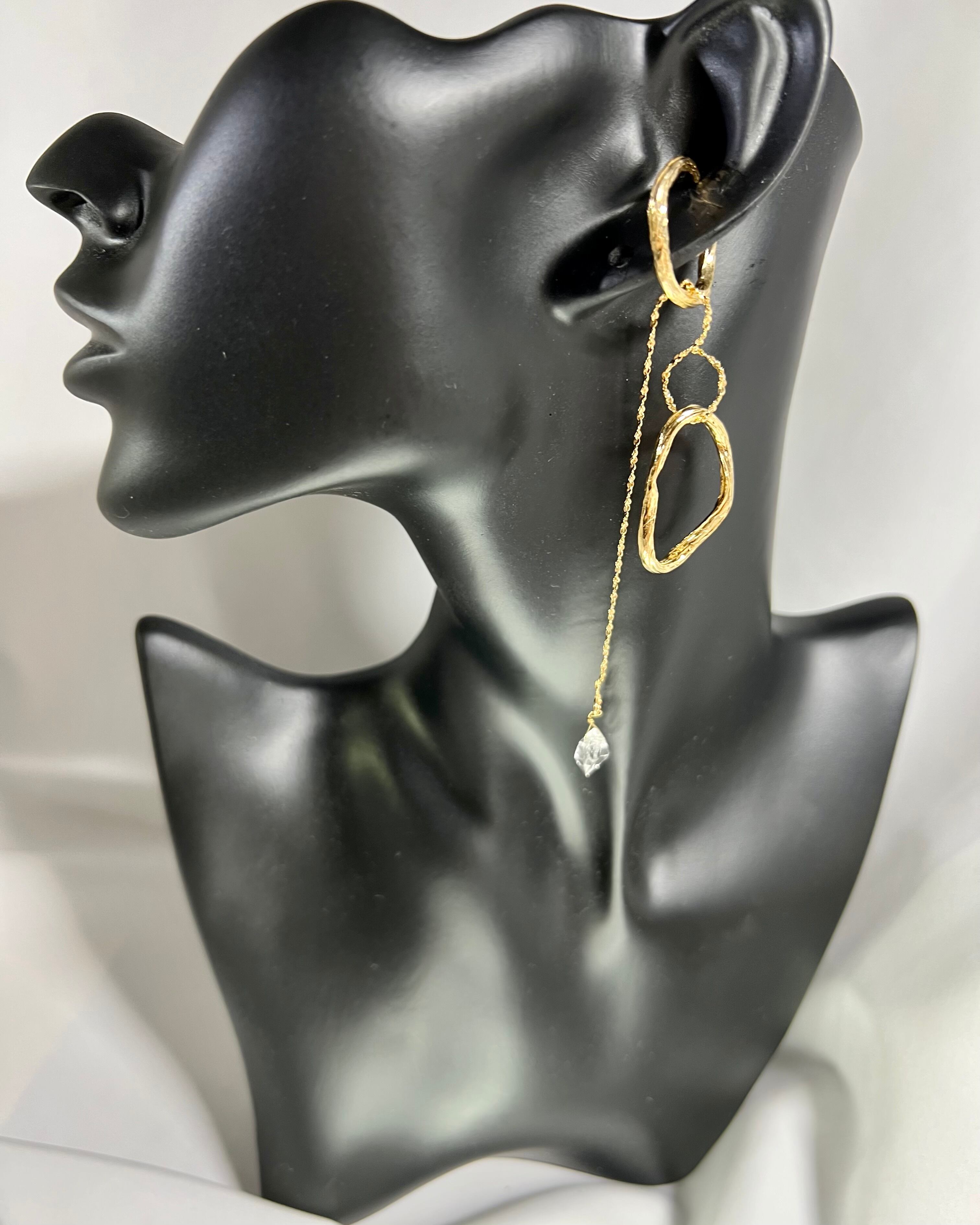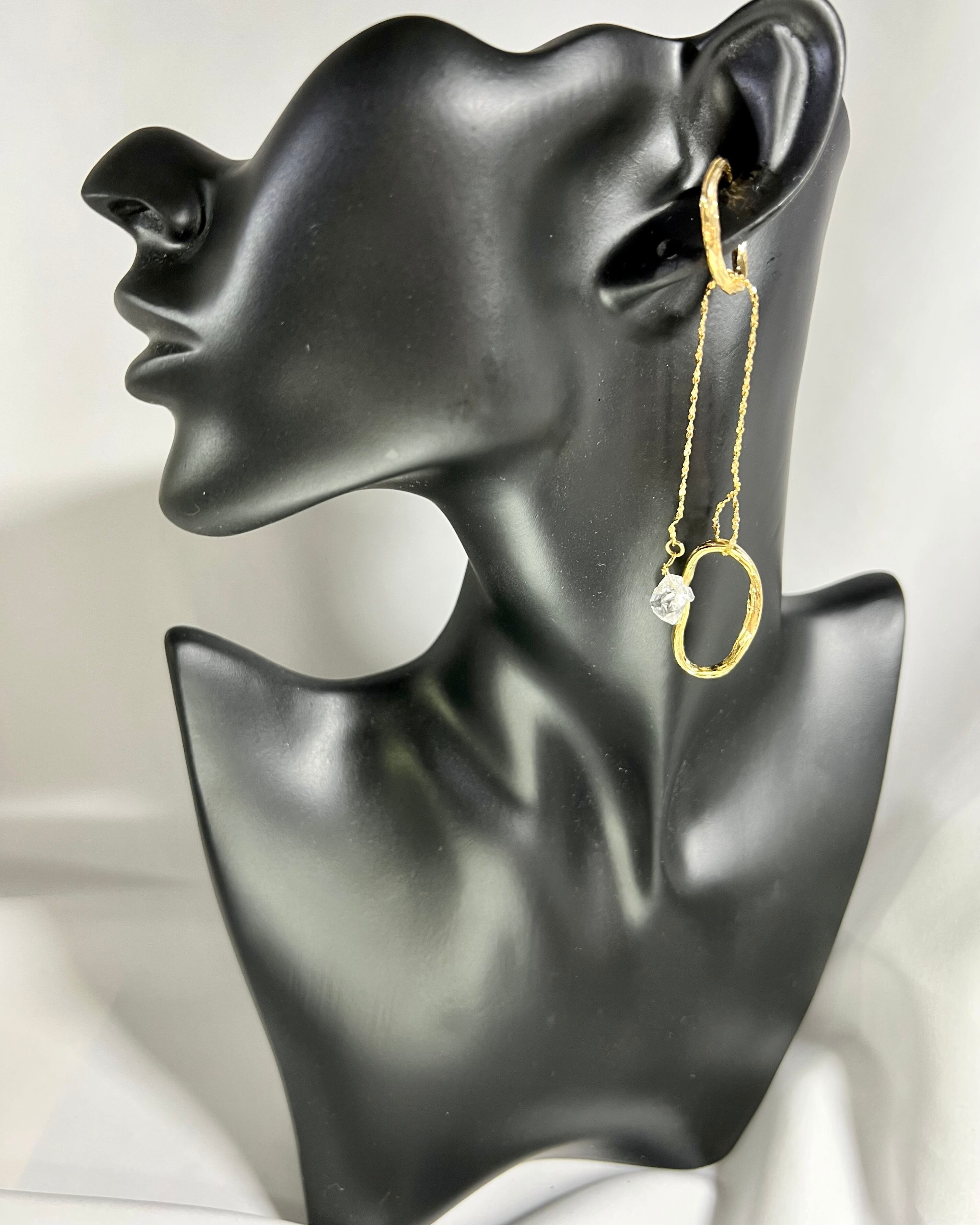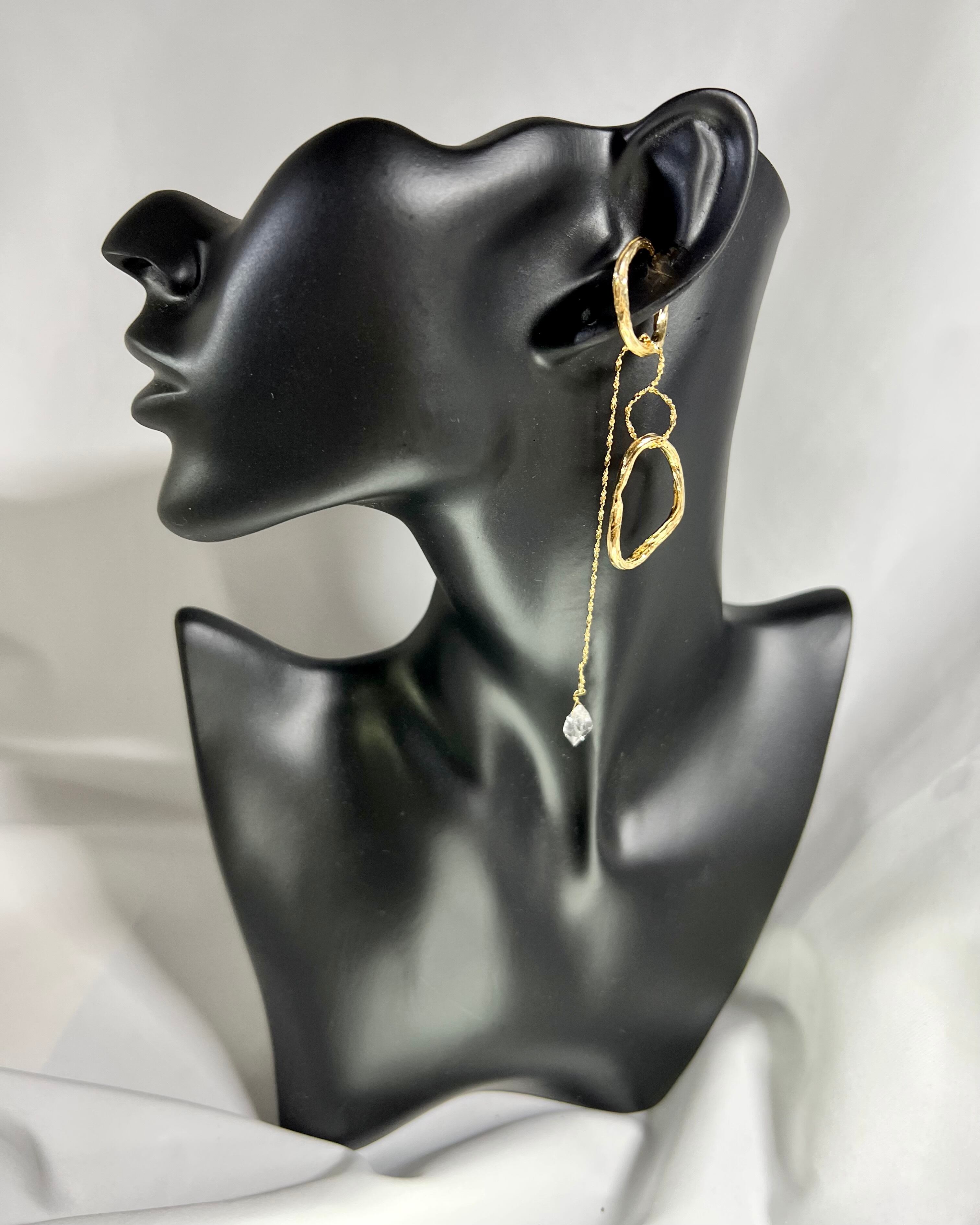 The Herkimer diamond sparkles with striking brilliance, while the gold loops create graceful curves, embodying both feminine elegance and bold sophistication. To enhance the cohesive design, the connecting loops have been deliberately crafted from the same chain material.